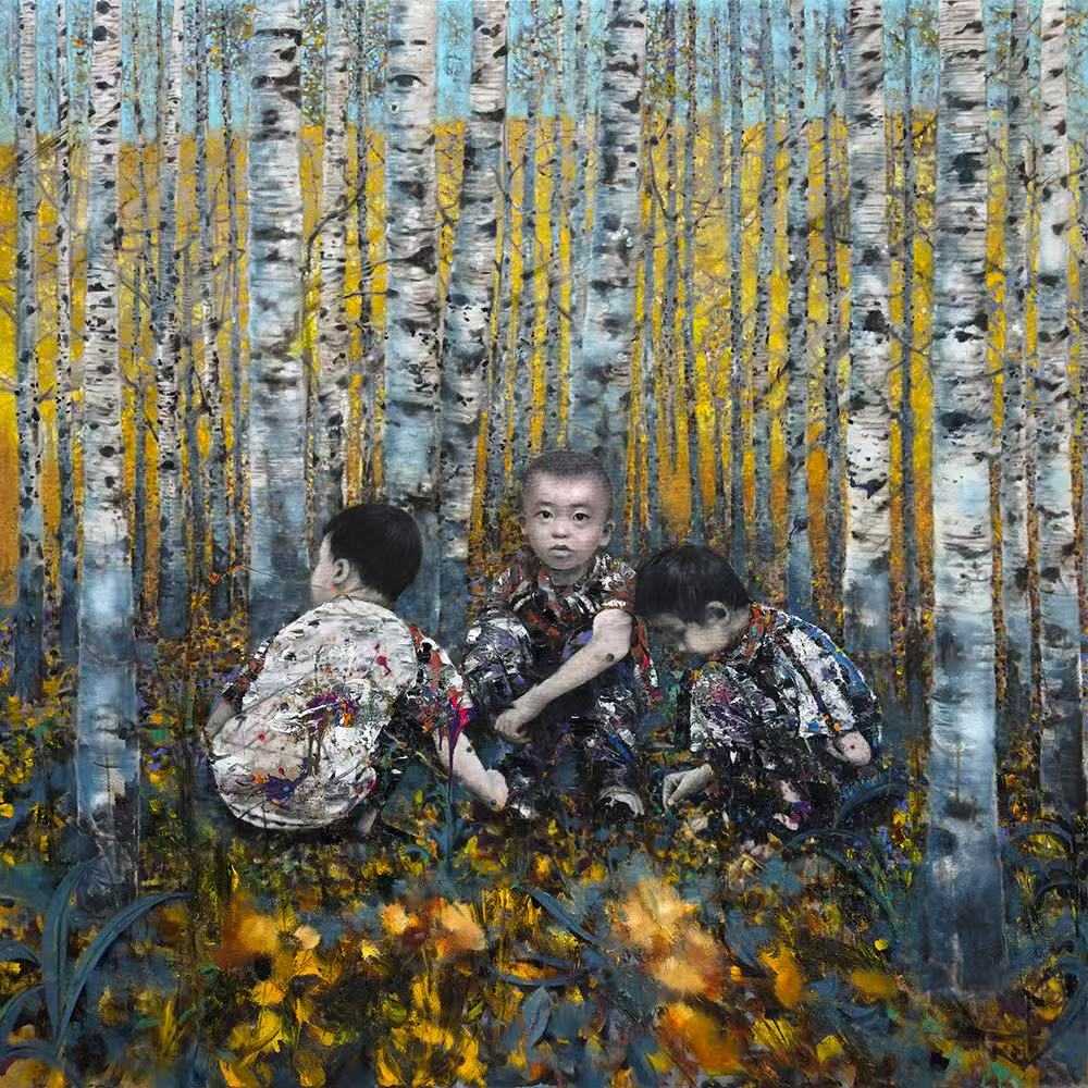 桦树林前蹲的三兄弟, 2025, 布上油画,72x72英寸