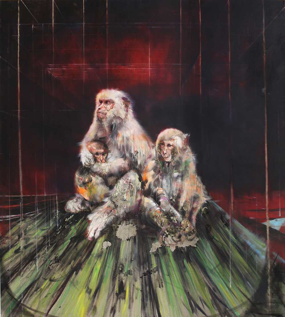 黑色空里的三只猴, 2019, 布上油画, 78x78英寸