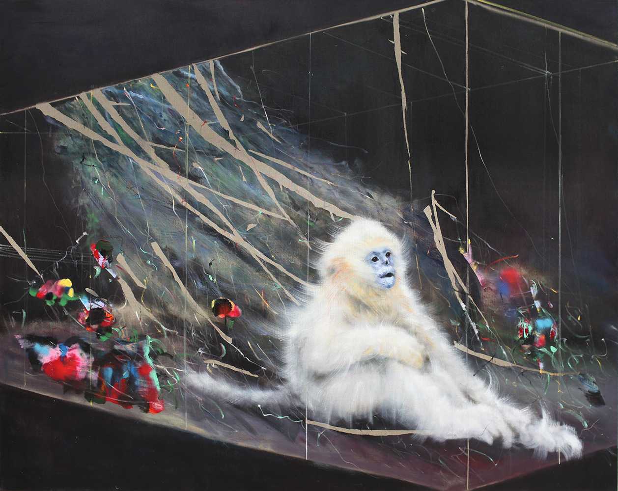黑色空间里的白猴, 2019, 布上油画, 62x78英寸