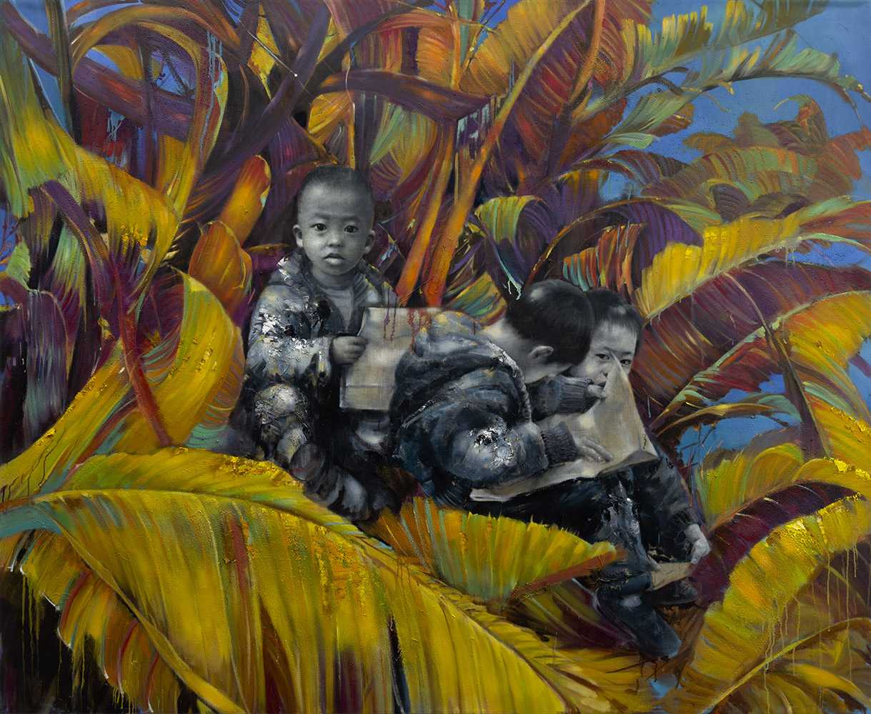 芭蕉树上的阅读, 2023, 布上油画, 64x78英寸