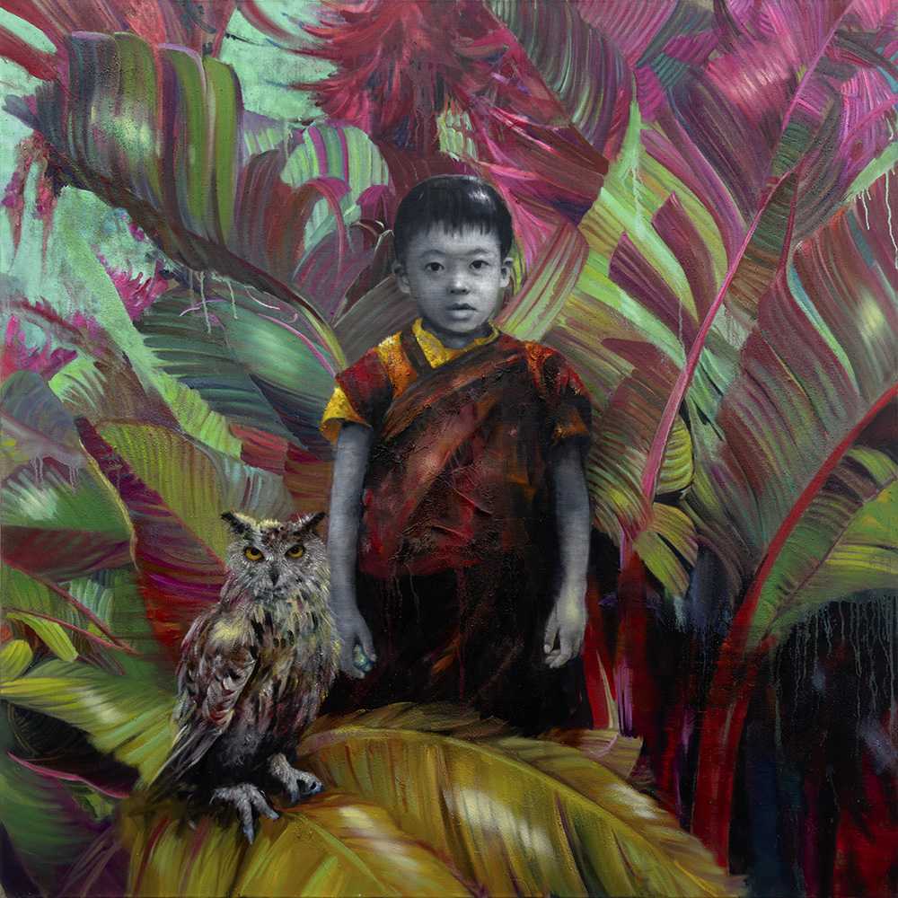 彩色芭蕉树前与猫头鹰, 2023, 布上油画, 62x62英寸