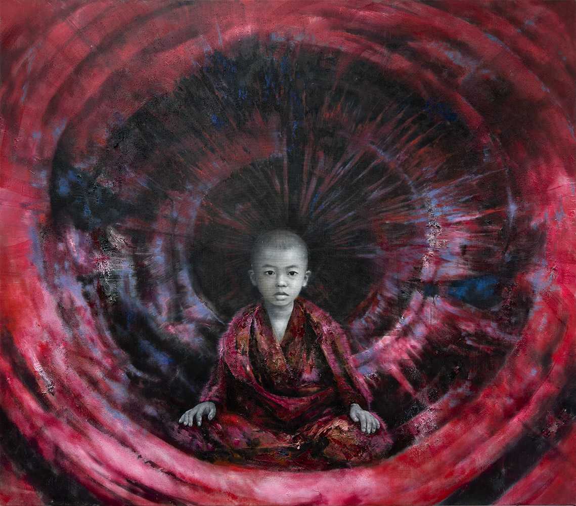 红色隧道前的静坐, 2023, 布上油画, 72x82 英寸