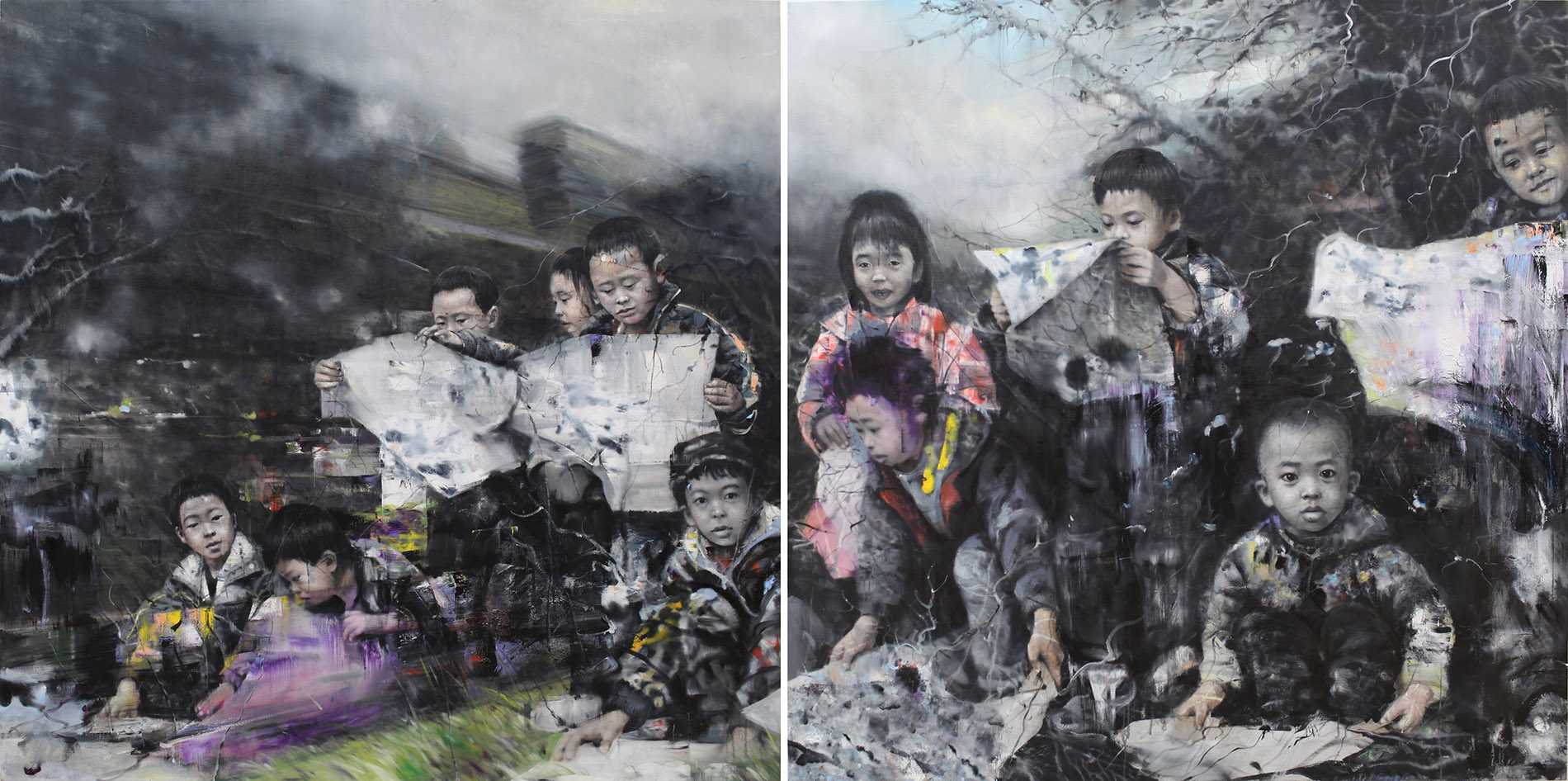 Le Quotidien du peuple, oil on canvas, 2017, 2 pieces together, each 68x68 inches
