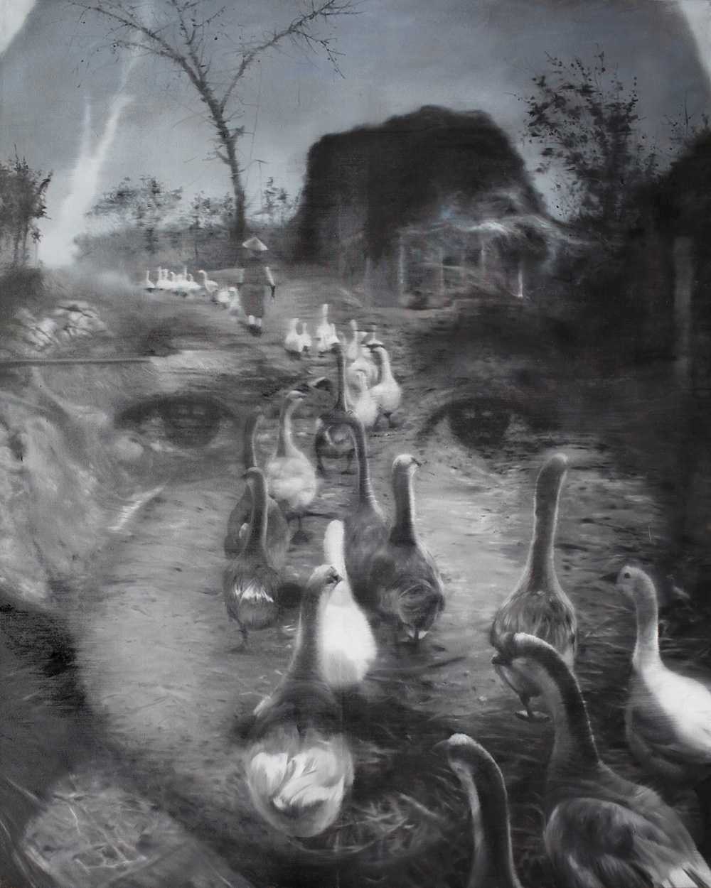 Self-portrait & countryside stage, 2013, oil on canvas, 198x160cm