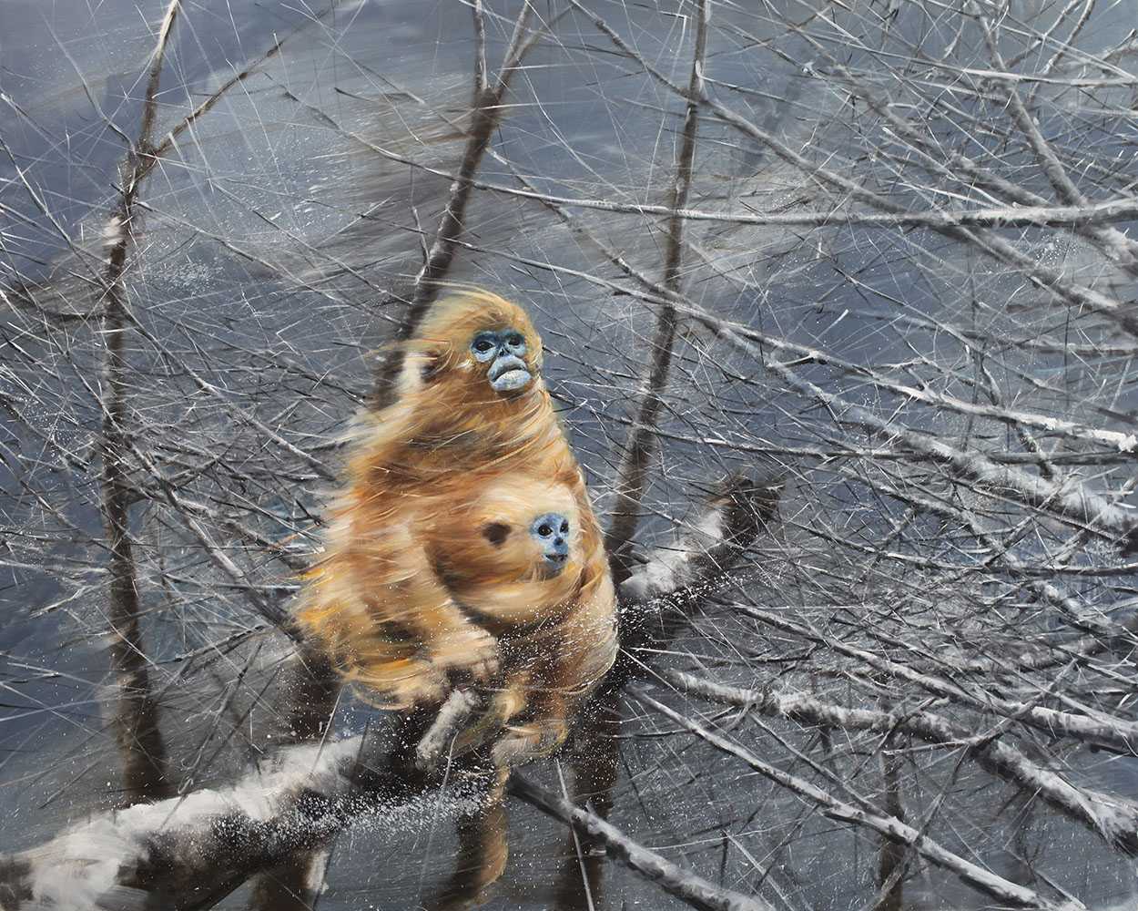 Monkeys inside the entangled snow tree, 2020, oil on canvas, 72x90 inches